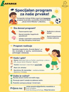 Зато је Lafarge Србија, као компанија која брине о својој локалној заједници и улаже у будуће генерације, омогућила овај бесплатан програм за прваке наше школе.