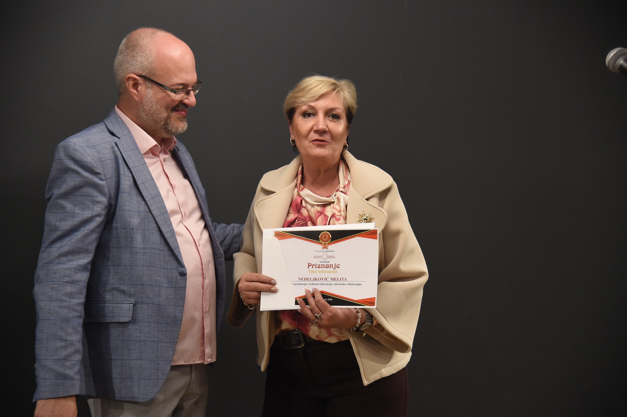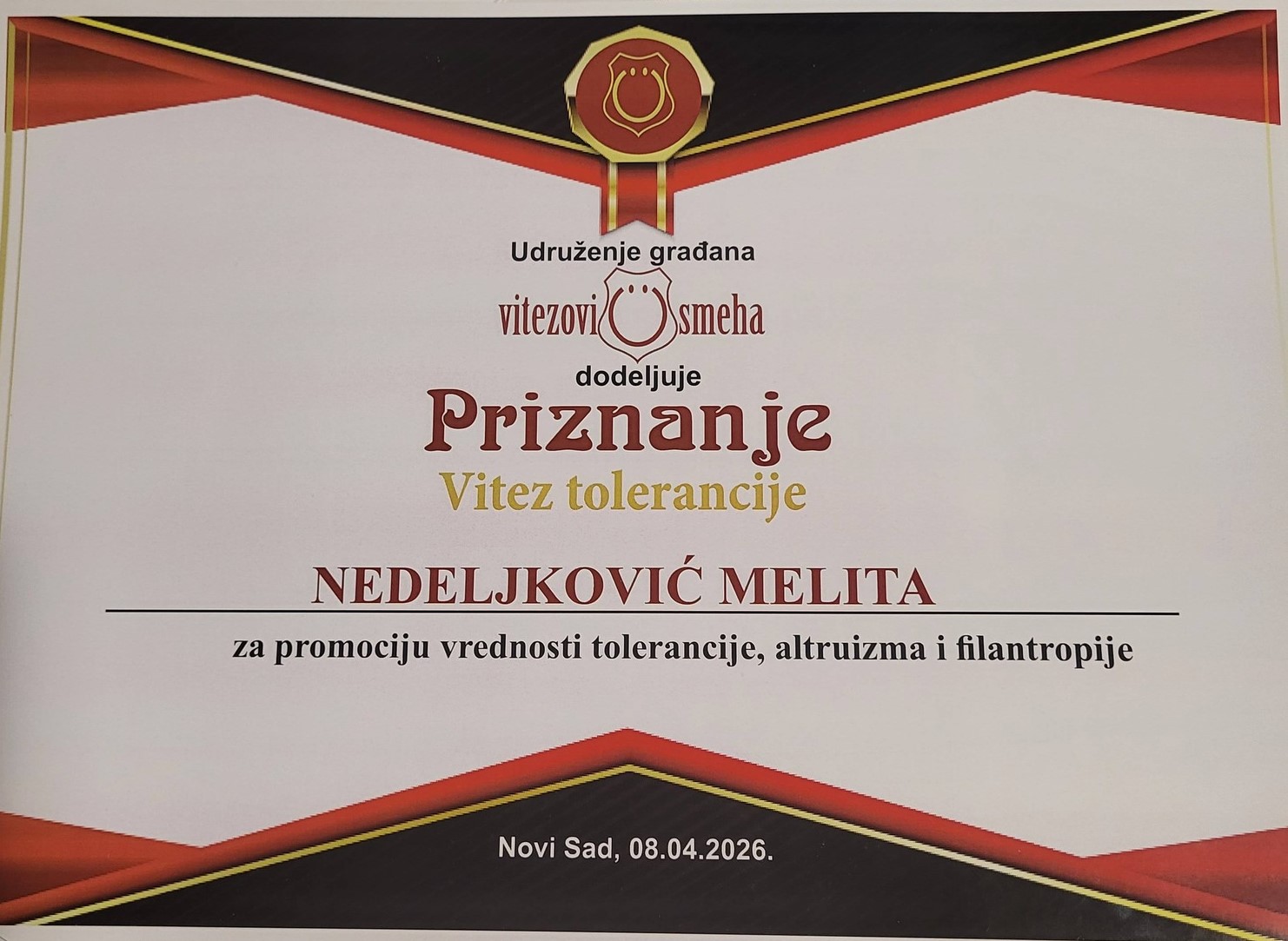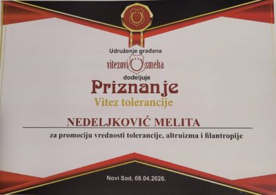 Признање ,,Витез толеранције” од истог Удружења, њеној учитељици-ментору Мелити Недељковић, уручио је председник Удружења Небојша Николић, 9.4.2026. године.