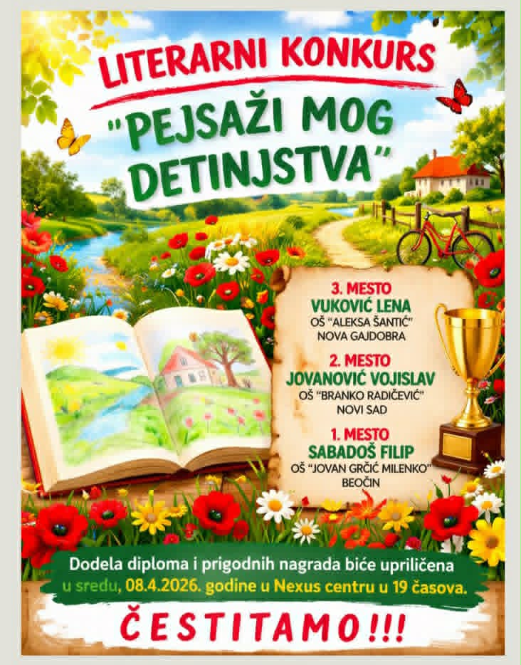 На литерарном конкурсу који је организовалo Удружење ,,Витезови осмеха” из Новог Сада, са темом ,,Пејзажи мог детињства”, ученик наше школе, Филип Сабадош, 7-1 одељење, ментор наставница Светлана Зарић, освојио је прво место и од “Витезова осмеха” на поклон добио лаптоп, 9.4.2026. године.